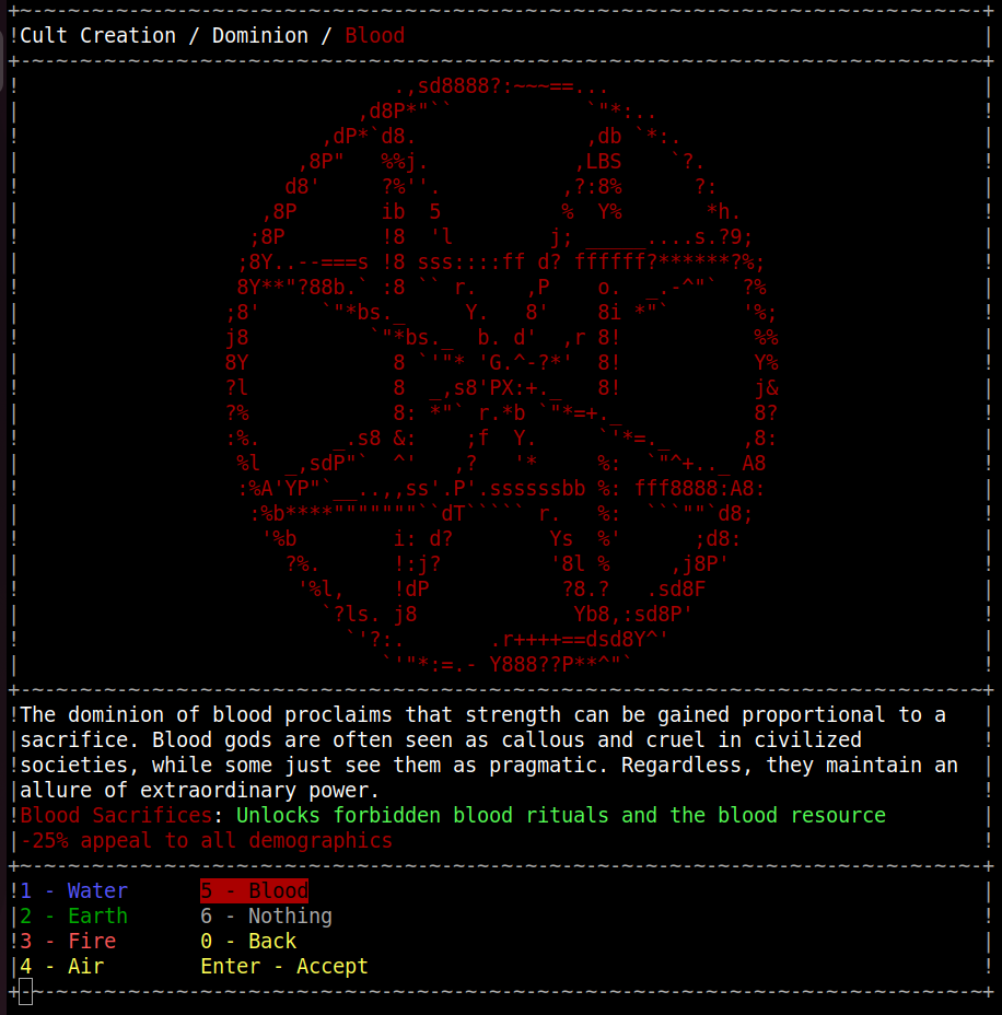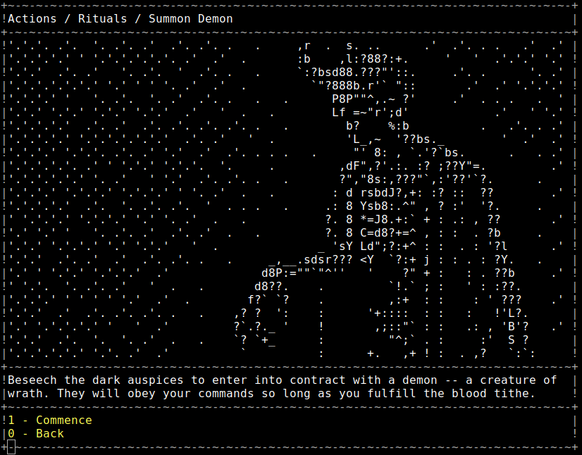 Collaborating with Bucephalus Studios on CultGame is the award-winning ascii artist littlebitspace, creating beautiful dark-fantasy ascii art for many parts of the game, and Evan Stevens, a musician bringing a groovy lofi hip-hop from hell soundtrack.